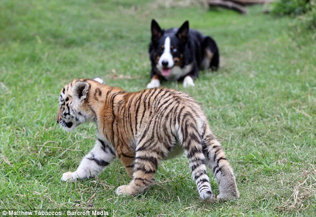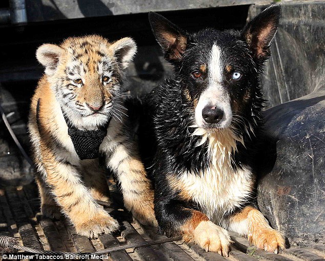 Колли делит с тигрятами не только свободное время, но и миску с едой. И больше всего внимания уделяет своему новому другу, который оказался сиротой и вместе с двумя братьями и сестрой попал в заповедник «Сивью».